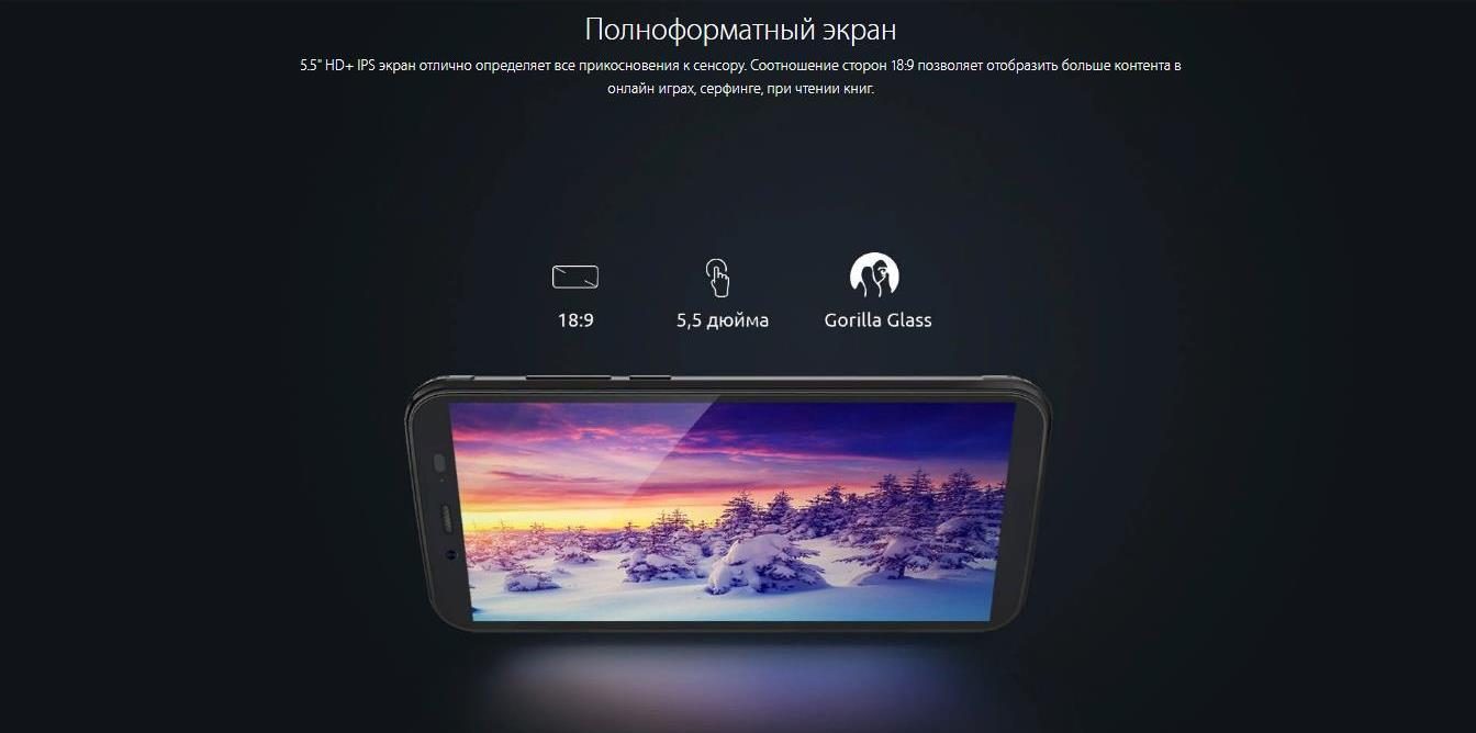 - Cмартфон оснащается 5,5-дюймовым IPS-дисплеем с широкоформатным соотношением сторон 18:9.